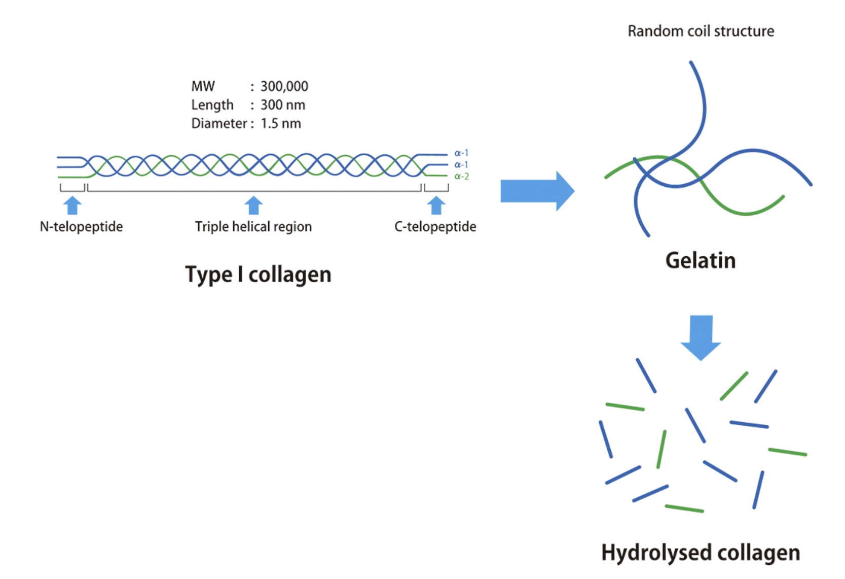 타입 I 콜라겐은 3개의 펩타이드가 꼬여서 약 300kDa (300,000 Da) 의 분자량 크기로 만들어집니다. 이것을 잘게 만들기 위해서 강한 산성으로 가수분해하면 작은 분자의 collagen 이 형성되며, 제품에 따라서 200~1000Da 정도로 작게 만들어 제품화 합니다. 더 작게 가수분해 될 수록 인체내 흡수가 더 효율이 좋다고 알려져 있습니다. 따라서 피부나 머리카락의 전반적인 탄력을 위한 콜라겐 보충제는 이렇게 작게 잘려진 콜라겐 제품을 선택하면 됩니다.