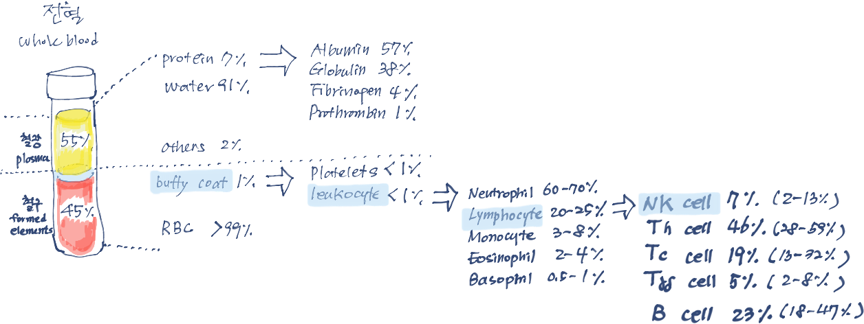 T 세포를 이용한 암 치료법이 시판 승인된 것이 많은 이유는 첫째 일단 T 세포가 체내에 많기 때문에 많이 뽑아내 활용할 수 있기 때문입니다. 이렇게 T 세포로 하여금 특정 항원을 보이는 암세포를 죽이게 하거나(TCR T cell), 어떤 특정 항원을 인식하도록 조작하게 해서 (CAR T cell) 주입해 놓으면, 이 세포들이 몇년이고 체내에 살아남아서 계속 그런 암세포들을 제거하기 때문에 효율적으로 암치료가 가능하기 때문이 두번째 이유이기도 합니다. 하지만 단점은...언제나 자기 세포만을 써야 한다는 점입니다. 다른 건강한 사람의 세포를 받아다 치료할 수 없습니다. T세포, B 세포 등 정교하게 적을 감지해서 죽이는 세포들에 비해 non-self 면 바로 살해해버리는 NK 세포는 그만큼 많이 필요하지 않을 수도 있습니다. 하지만 이것 저것 가려서 암세포를 죽여 제거하기에는 시간도 너무 없고, 너무 많아져버린 암세포를 T 세포가 다 없애기도 벅찬 일입니다. 암세포는 T 세포를 교묘하게 속이기도 합니다. 따라서 이럴 때 NK 세포가 시간 끌지 않고 속전 속결로 살해해주면 좋은데, 불행히도 NK 세포는 그 숫자가 적습니다. 겨우 1억개 정도가 체내에 돌아다니고 있습니다. 다른 면역세포의 10% 도 안되는 숫자입니다. 게다가 체내에서 3주 정도밖에 살아남지 못합니다. 따라서 NK 세포를 치료용으로 쓰려면 체외에서 아주 많이 많이 세포 분열을 시켜 줘서 2-3주에 한번씩 주기적으로 다시 환자에게 넣어주는 것이 필요합니다. 이러한 단점에도 불구하고 부인못할 NK 세포만의 강점이 있습니다. NK 세포는 다른 사람의 것을 쓸 수 있습니다. 암환자의 병 진행속도는 매우 빠릅니다. T세포, NK 세포를 환자피에서 추출해서 실험실에서 세포분열시켜야 하는데, 이 기간이 2-3주는 걸립니다. 그 동안 환자의 암세포가 기다려주는 것도 아닙니다. 이럴 때 미리 많은 수로 불려 놓은 세포수를 가진 다른 사람의 NK 세포를 환자에게 주입할 수 있다면 좋을 것입니다.
