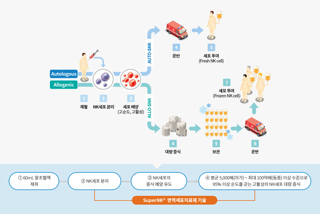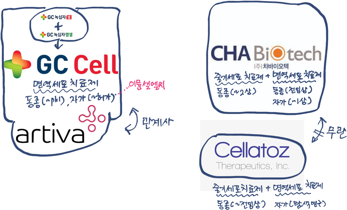 NK 를 포함해서 면역세포치료제를 개발하는 국내 회사는 큰 회사로는 녹십자 계열 지씨셀, 그리고 차바이오그룹의 차바이오텍이 대표적인 것으로 알고 있습니다. 지씨셀은 2007년에 간세포암의 잔류암 제거용으로 적응증으로 허가받은 이뮨엘씨주가 상업화되어 있습니다. 간세포암 환자들 뿐 아니라 일반 고형암 환자들도 비급여를 무릅쓰고 치료받고 싶어하고 또 실비보험으로도 감당하기도 합니다. 이뮨엘씨주는 사이토카인 유도활성 살해세포 (Cytokine induced killer cells)와 세포독성 T세포 (Cytotoxic T lymphocyte) 로 이루어져 있어서 일반 NK 세포보다 암세포 살상 능력이 더 강하다고 합니다. NK 세포연구는 그만큼 지씨셀이 전통적인 강자였고, GCCELL 이 보유한 NK 세포기술은 GC(녹십자홀딩스)와 GC녹십자랩셀이 합병하기 전 조인트로 설립한 ARTIVA 사에 기술이전되어 미국 현지에서도 개발이 진행중입니다. 차바이오텍은 예전부터 NK 세포치료를 연구해왔지만 세포치료제 기반이 잘 구축되어 있는 일본 등지에서 사업을 해왔던 것으로 알고 있습니다. 최근 몇 년 전에는 NK 연구에 주축이 되었던 임재승 박사팀이 퇴사하여 셀라토즈를 창업하고 난 뒤에 차그룹 쪽의 NK 세포치료는 상대적으로 초기개발단계에 머물러 있고 줄기세포 플랫폼에 기반한 세포치료제를 더 선두에 두고 개발하고 있는 것으로 보입니다.