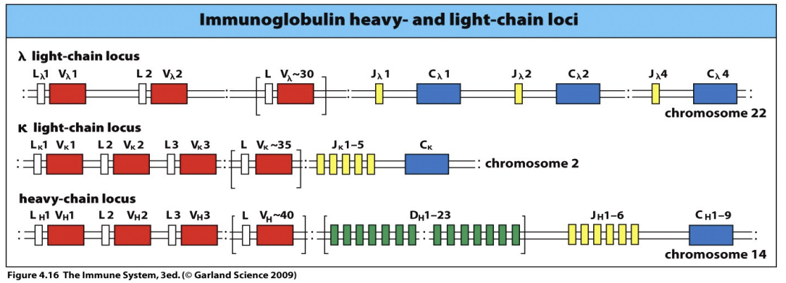 Immunoglobulin의 중쇄(H), 경쇄(kapha+lammda)와 TCR의 beta, alpha 사슬 비교