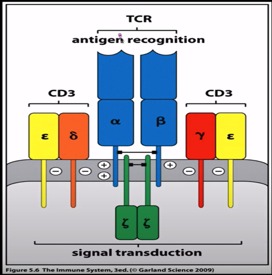 베타와 알파 사슬이 모두 결합하여 T 세포 수용체를 구성하지만 이 물질이 cd3 분자와 상호 작용할 때 TCR complex 라고 부르게 됩니다.  이것이 TCR cd3 복합체입니다.
