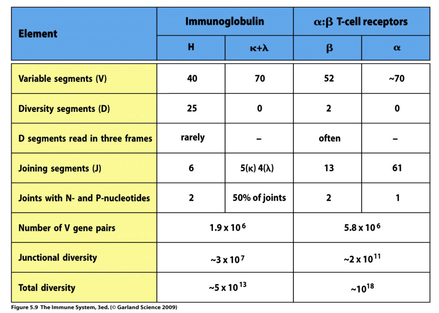 BCR 과 TCR diversity 정도의 차이: TCR 이 10만배 (10^5) 더 다양하다.