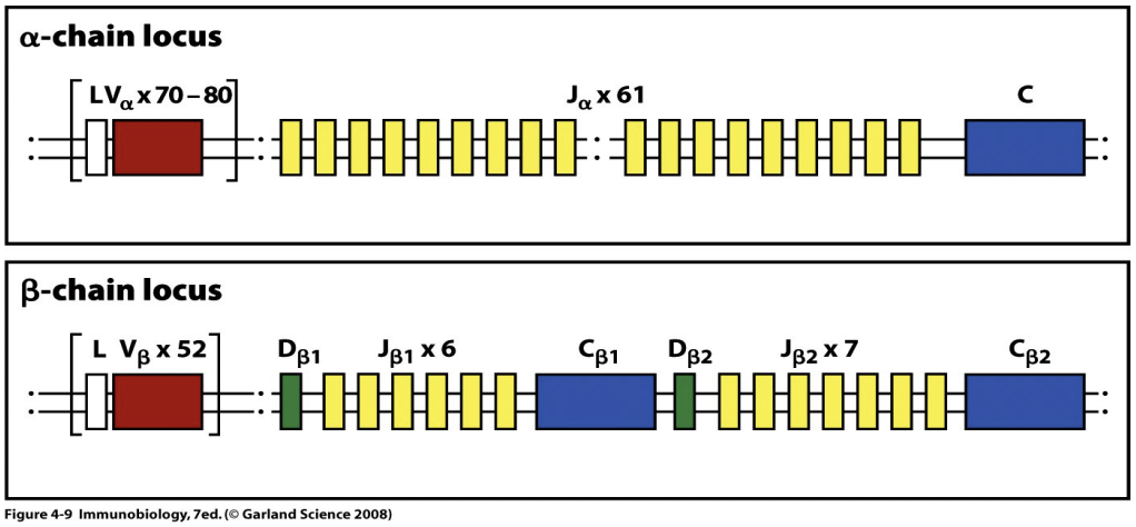 (1) 알파베타 TCR에서는 BCR의 Immunogloblulin (Ig ) 보다 좀 더  다양합니다. TCR의 beta는 52개, Ig의 중쇄는 40개죠. 그러나 알파는 조금 덜 다양합니다.